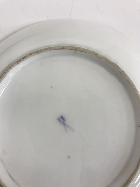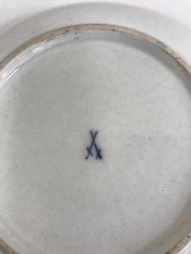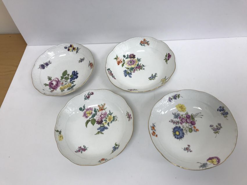 A set of four 19th Century Meissen bowls or shallow dishes with basket weave borders and gilt rims, the centre fields decorated with floral sprays, 21 cm diameter, bear blue crossed swords marks to underside
