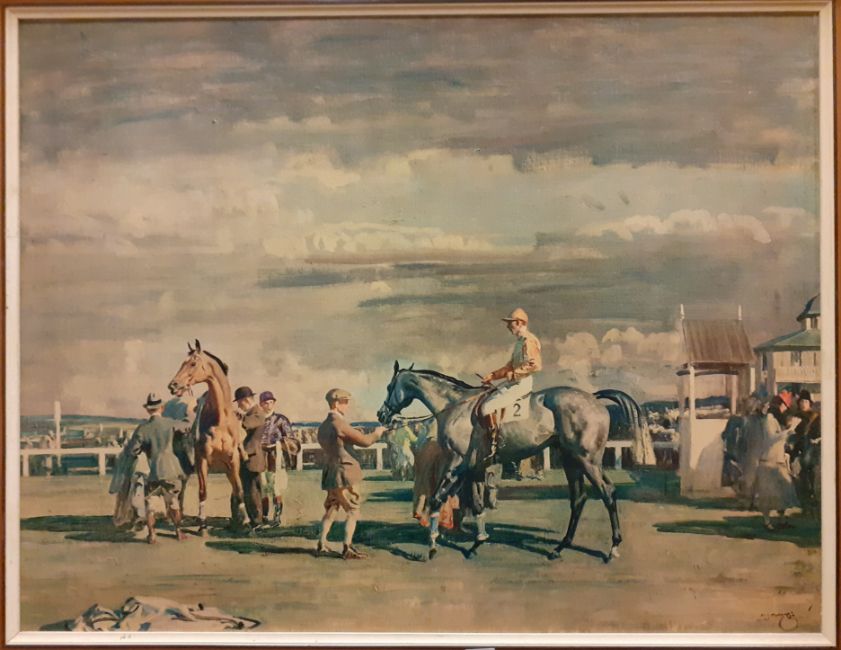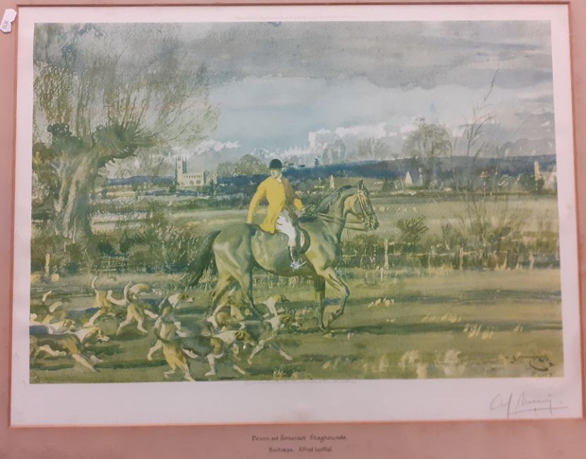 AFTER ALFRED J MUNNINGS "Devon and Somerset Stag Hounds, Huntsman Alfred Lenthal", colour print, signed in pencil lower right, image size 38 cm x 55 cm, together with three further colour prints by the same hand including "The Huntsman", "Saddling Paddock Cheltenham" and "After the race"