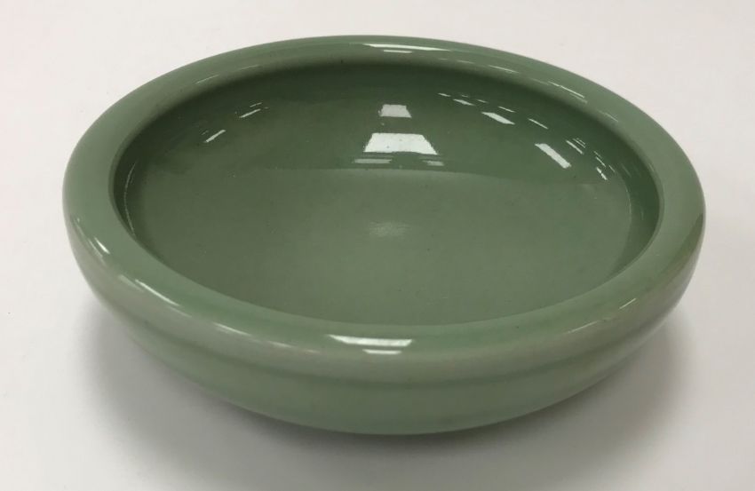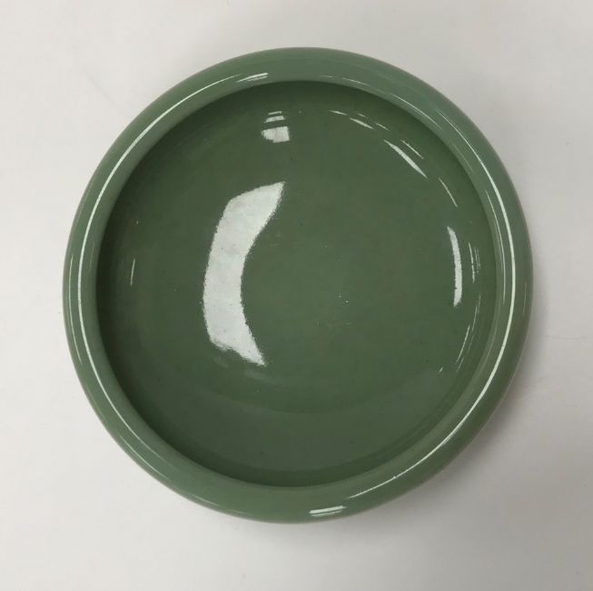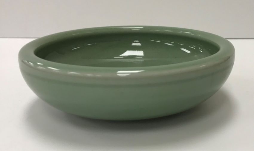 A Royal Copenhagen celadon glazed bowl of plain form raised on a shallow circular foot bearing blue underglazed wave mark and No.'d 1/2882