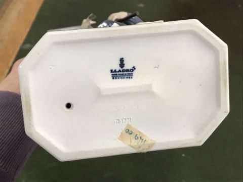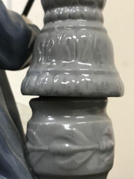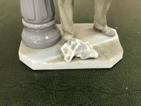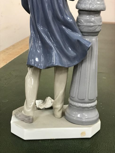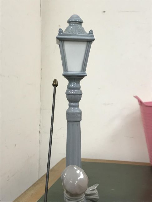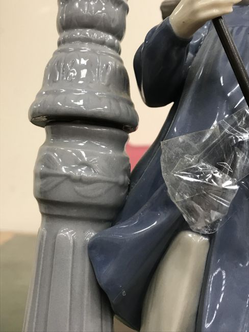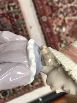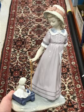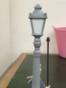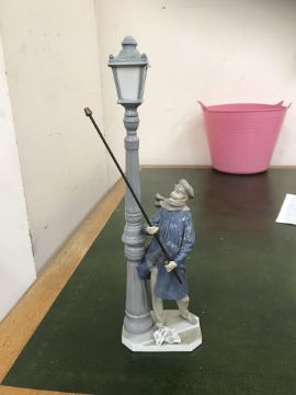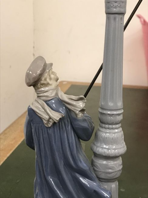 Lladro only - the Lamplighter - the lamp itself looks a bit askew, the figure's thumb is broken and the metal lighting torch is loose. In need of a good clean. The figure of the young girl with pull along dolly has had significant damage to her head/hat. All other Lladro pieces, general wear and tear conducive with age and use, in need of a good clean