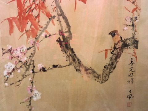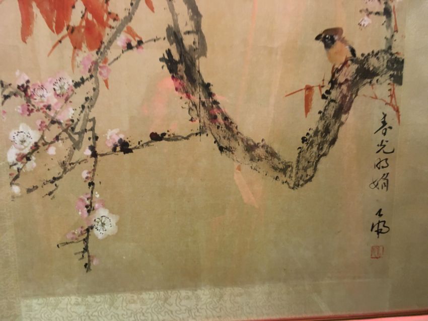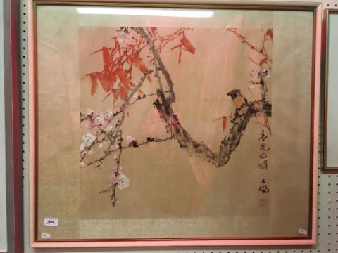 CHINESE SCHOOL "Bird amongst blossoming foliage" colour print with script within a fabric border 67 cm x 80 cm together with four further various studies of birds amongst blossom and foliage and a pair of 20TH CENTURY CHINESE SCHOOL studies of "Qianlong Emperor and Empress" watercolour on silk 22.5cm x 16cm