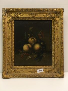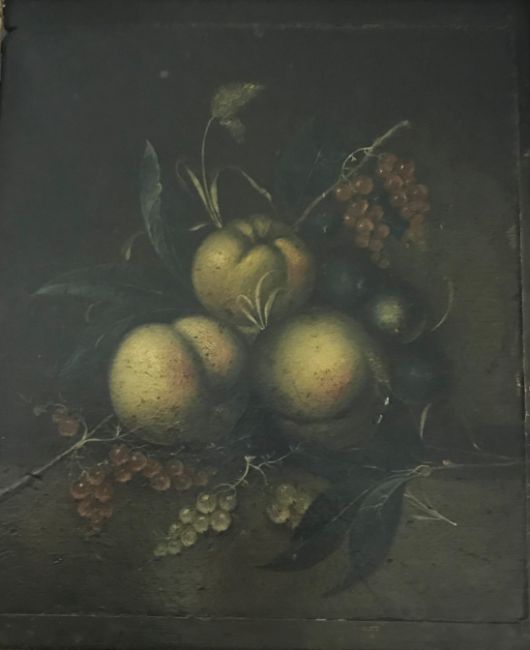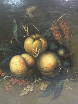 A FOLLOWER OF MARIA VON OSTERWYCK (1630-1693) "Fruit on a stone ledge", oil on panel, unsigned, inscribed on label verso "No 35 Marie Van Osterwyck - 1630-1693....... fruit... pain....", 29 cm x 24 cm