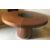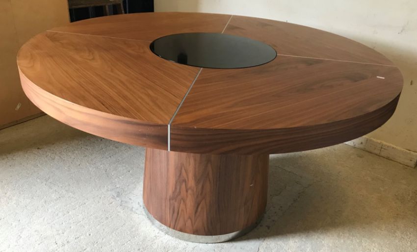 A modern walnut circular dining table with remote controlled light up glass intregral Lazy Susan raised on a tapered pedestal base, 140cm diameter
