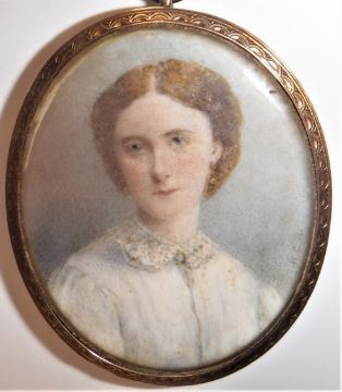 HENRY CHARLES HEATH (1829-1898) "Young lady in white shirt with lace collar and turquoise coloured brooch", a miniature portrait study, watercolour on ivory, oval, signed within initials "HCH" lower right, housed in a yellow metal frame with engraved border, 6.5 cm x 5.4 cm (Provenance: Lady Northcliffe thence by descent)