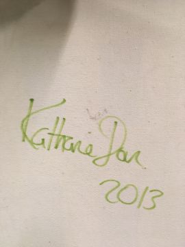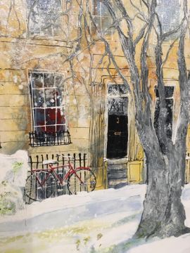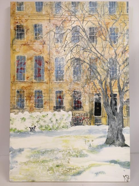 KATHERINE DOVE "Cheltenham houses in snow with dog and bike in foreground" oil on canvas, initialled lower right, signed and dated 2013 verso 91 cm x 61 cm