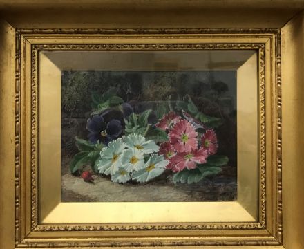OLIVER CLARE (1853-1927) "Pansies and primulas on a mossy bank", oil on canvas, signed and dated '95, 15.5 cm x 20.5 cm
