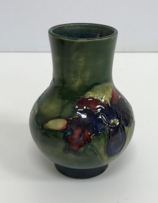 A Moorcroft green ground pansy decorated pedestal bowl raised on a circular foot 15 cm diameter x 11 cm high together with a similar baluster vase of small proportions 10.5 cm high