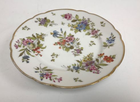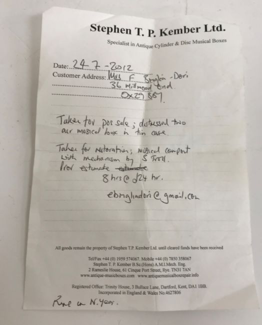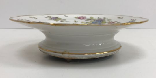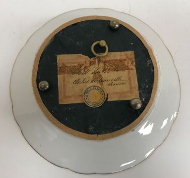 A 19th Century porcelain tazza musical box with floral spray decoration, the two air movement by S Troll of Geneva (late Geo. Baker & Co.), bears old labels to underside, 22.5 cm diameter x 6 cm high, together with invoice for restoration work by Stephen T P Kember Ltd of Rye dated 7.2.2013
