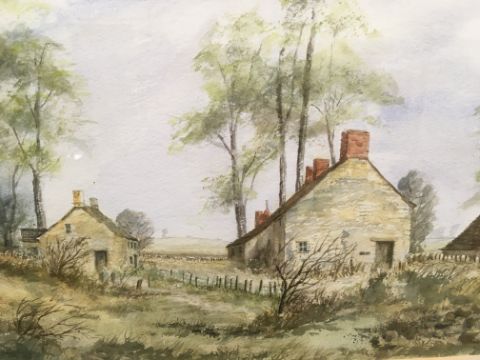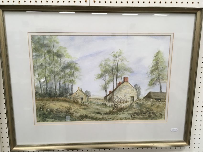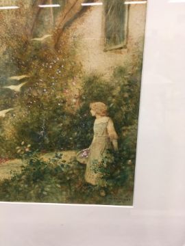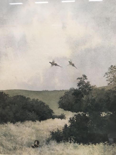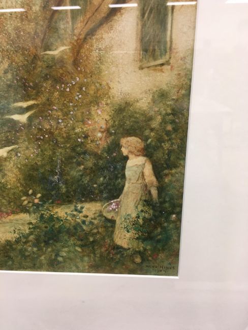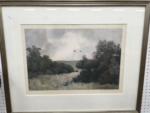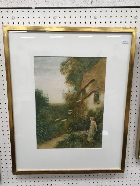 FRED HINES "Girl with basket of flowers by thatched cottage" watercolour heightened with white and body colour, signed and dated 1905 lower right 38 cm x 27 cm together with ELIZABETH HUDSON "Downs Farm" watercolour, heightened with white, signed lower left 32 cm x 48 cm and AFTER JONATHAN SAINSBURY "Spaniel putting up pheasant in a woodland" colour print, limited edition 500/600, signed in pencil lower right 32 cm x 47.5 cm