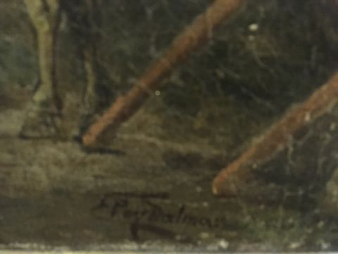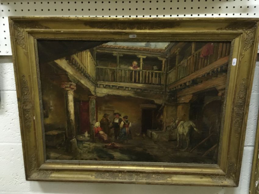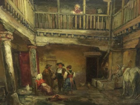 EMILIO POY DALMAU (1876-1933) "Spanish Inn courtyard with figures", inscribed "........el meson del Sevillano dande vivio Cervantes en Toledo" (the inn of Seville where Cervantes lived in Toledo) and "purio de la posada de la sangre) (.... of the inn of blood), oil on canvas, signed and dated 1938 and inscribed "Madrid" lower right, 49 cm x 70 cm