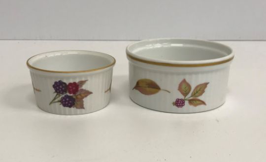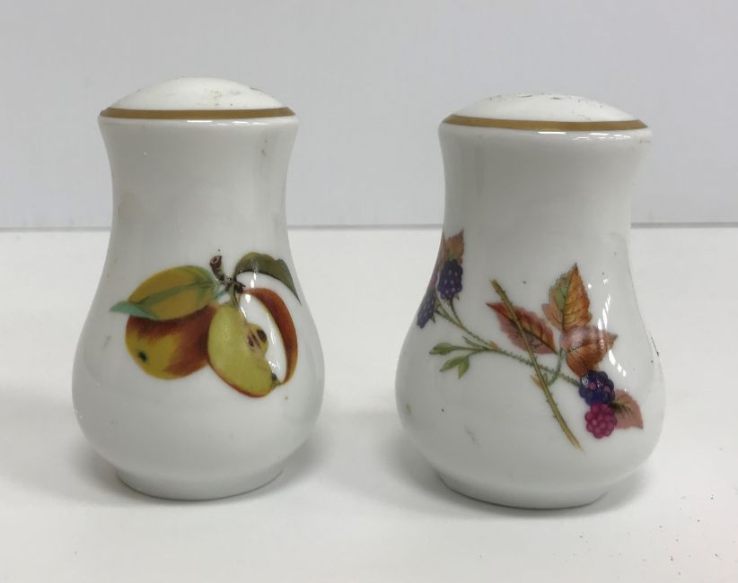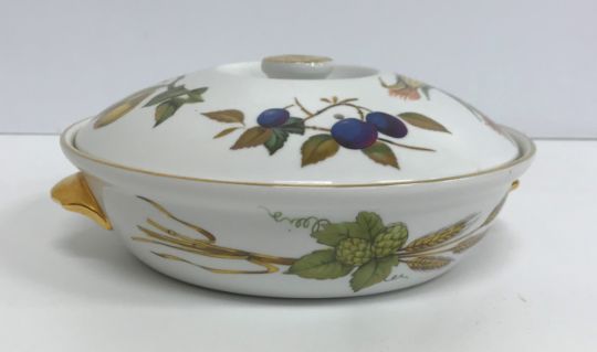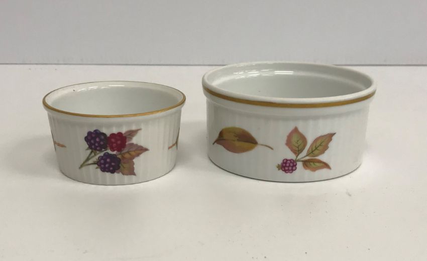 A collection of Royal Worcester Evesham pattern dinner wares including eight dinner plates, eight bowls, eight dessert plates, eight side plates, five large ramekins, five small ramekins, two oval vegetable dishes, sauce boat and stand, salt and pepper, two flan dishes, an oval serving dish, two vegetable tureens, one with lid and an oval lidded casserole