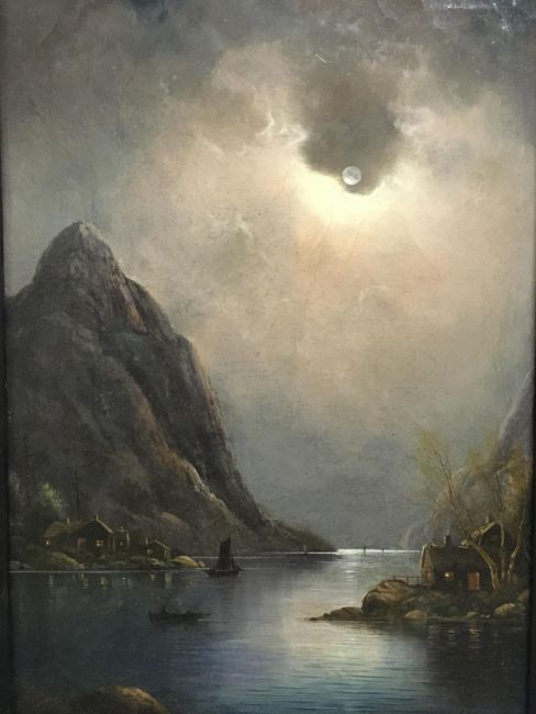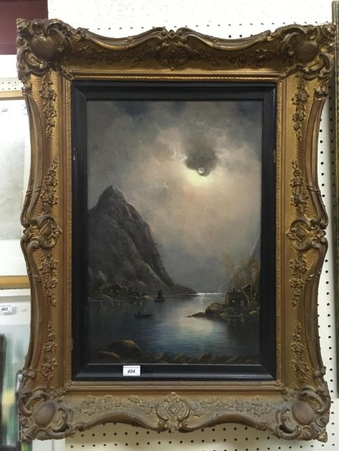 NILS HANS CHRISTIANSEN (Danish 1850-1922) "Winter moonlight" a coastal scene with boats and dwellings, oil on canvas, signed lower left 61.5 cm x 45.5 cm
