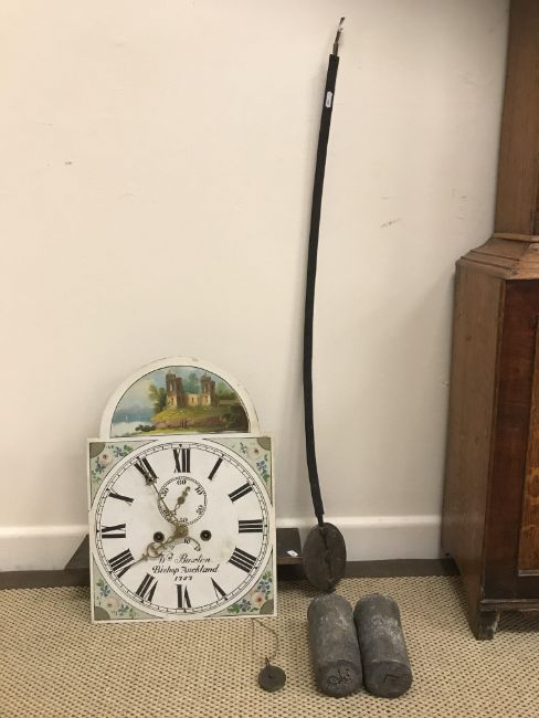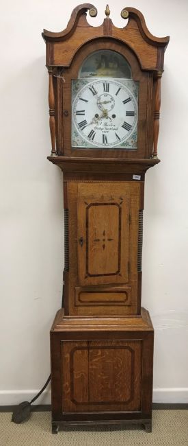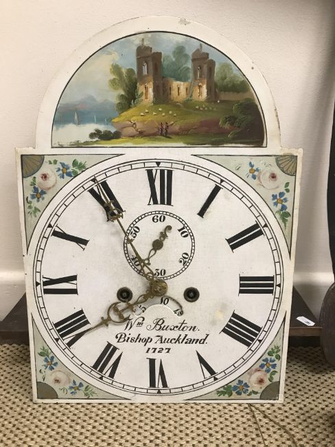 A 19th Century Manchester style oak cased long case clock, the eight day movement with painted arched dial and Roman numerals to the chapter ring enclosing a subsidiary seconds dial and date aperture and inscribed "Wm Buxton Bishop Auckland 1727" 55 cm wide x 23 cm deep x 220 cm high