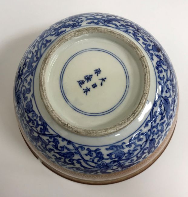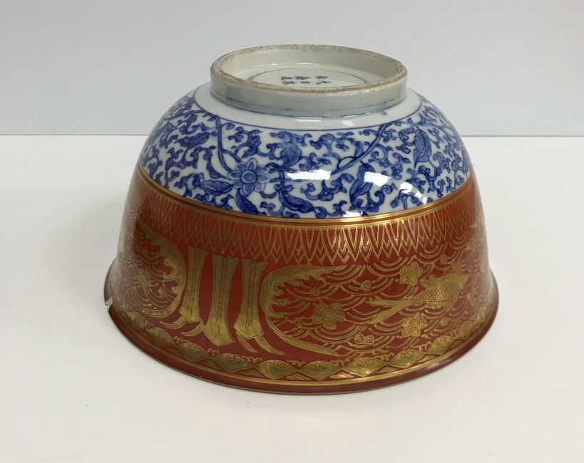 A Chinese oxide red and gilt banded blue and white deep bowl, the centre medallion decorated with phoenix within similarly decorated medallions, bears six character mark to base within two concentric rings raised on a carved wooden stand. Bowl dimensions 24 cm diameter x 12.5 cm high