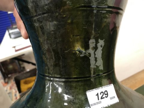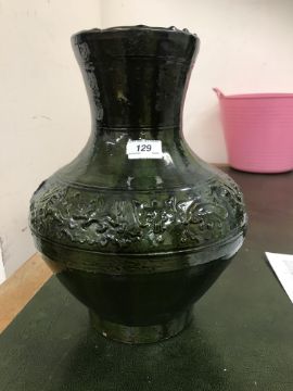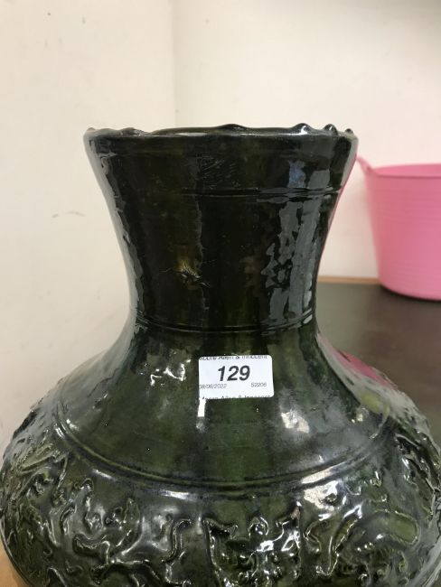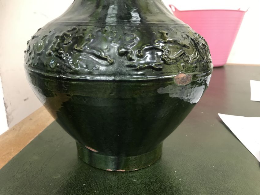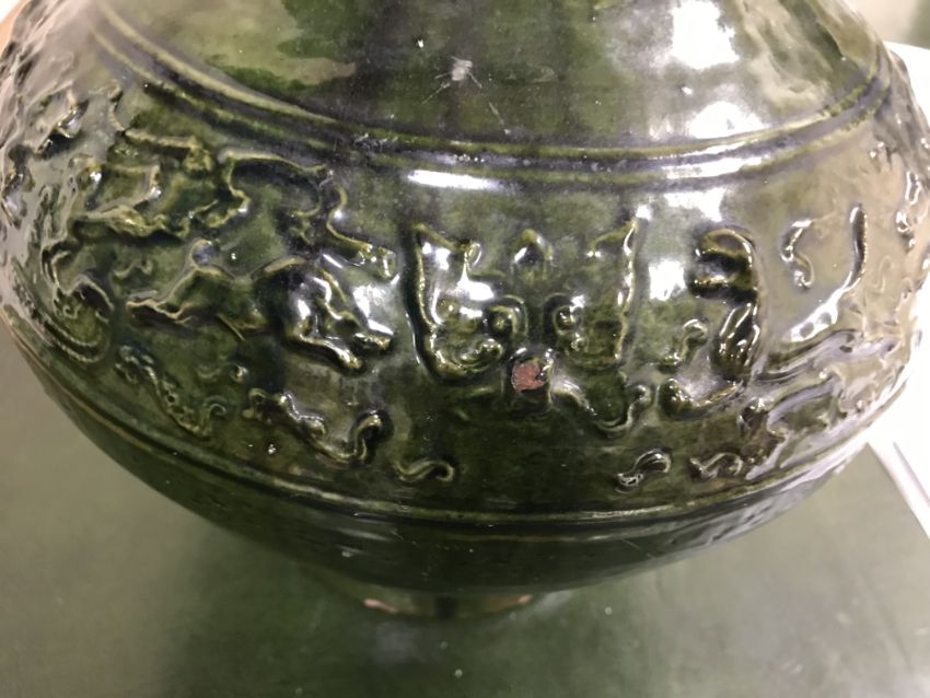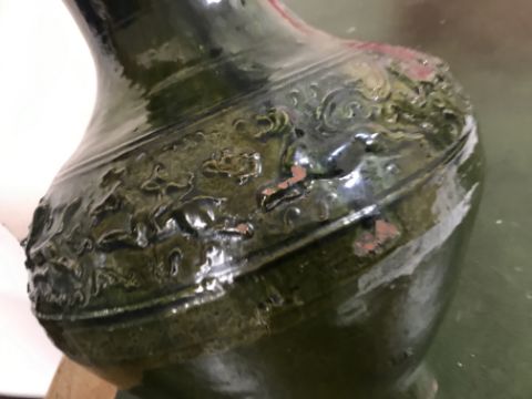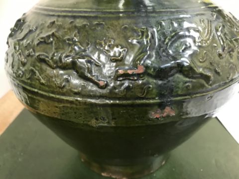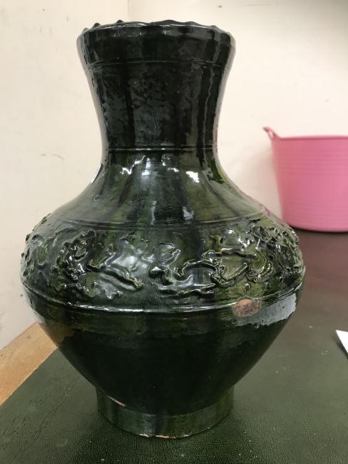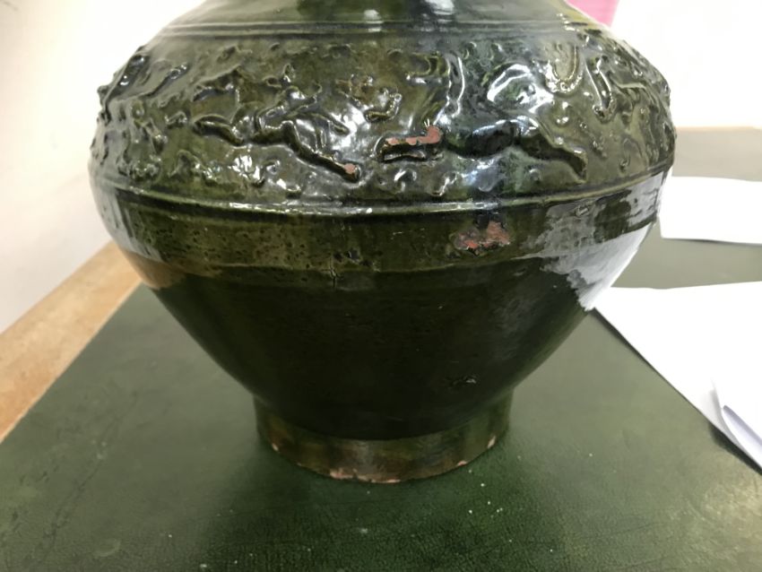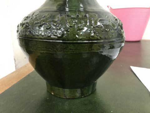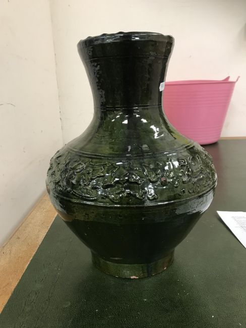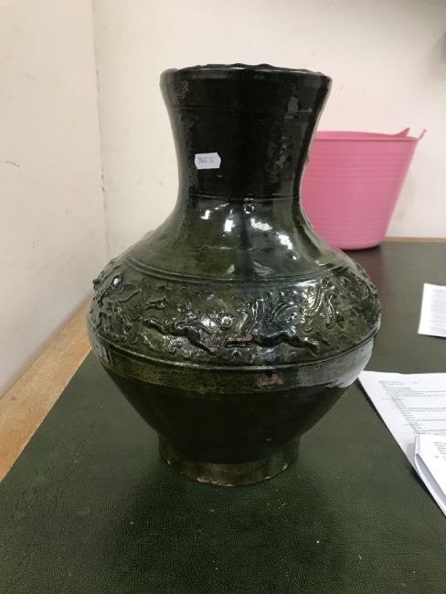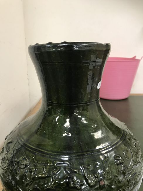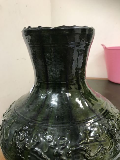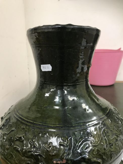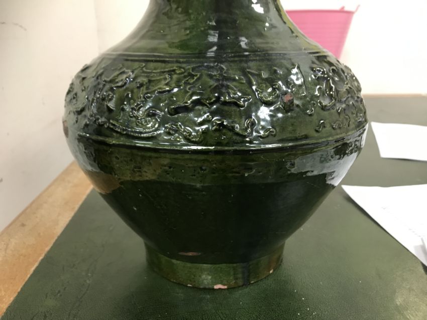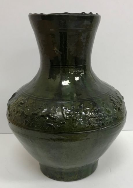 A Chinese red pottery Hu vase, Shanxi / Henan Province early Eastern Han Dynasty circa 25-220 A.D. with copper tinted green lead glaze and relief decorated with various figures of animals, bats and scrolling foliage, 37 cm high
