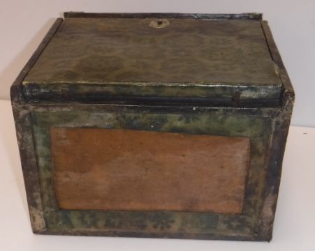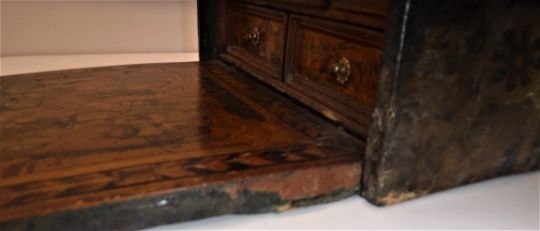 Metalwork with some oxidisation, wear and dirt. Rear bracket missing one pin to the top. Leatherwork basically extant but with some signs of old worm and rippling in various places. Interior lid with patches to the two parquetry work panels - see images. Interior tray with split to the right hand banding and signs of wear and tear throughout. The marquetry inlaid panel with signs of scratching in several areas, denting etc conducive with age and use. Colours of parquetry work basically good having been enclosed - see images for further detail. Base appears basically sound though very basic, presumably as would not be seen. Again, see images for further detail re: leather wear and tear etc