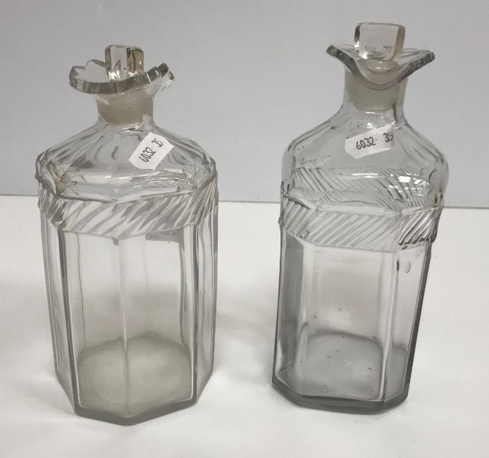 A pair of late 18th Century faceted and wrythen cut decanters and stoppers the scalloped rims with pouring lip and stoppers 17 cm high