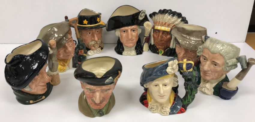 A collection of Royal Doulton large character jugs comprising George Washington (D6669), North American Indian (D6621), Bonnie Prince Charlie (D6858), Character jugs from Williamsburg - Apothecary (D6567), Tam O'Shanter (D6632), The Gardener (D6630), The Poacher (D6429), The Antagonists Collection - Battle of Little Bighorn 1876 George Armstrong Custer/Sitting Bull (D6712) limited edition 8655/9500 and Monty
