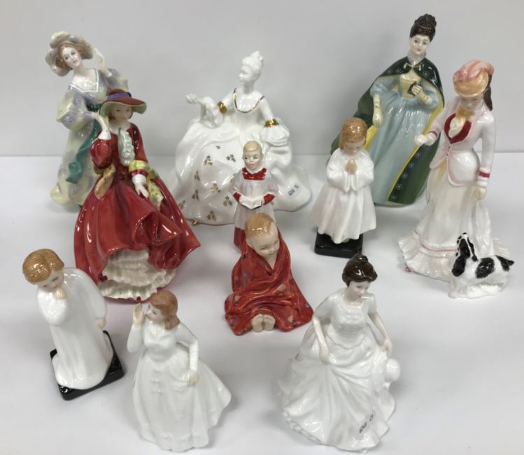 A collection of Royal Doulton figures comprising "Top o' the hill" (HN1834), "Grand Manner" (HN2723), "Premier" (HN2343), "Harmony" (HN4096), "Choir Boy" (HN2141), "Bedtime" (HN1978), "Darling" (HN1985), "This Little Pig" (HN1793), "Joy" (HN3875), "Sarah" (HN3857) and "Antoinette" (HN2326)
