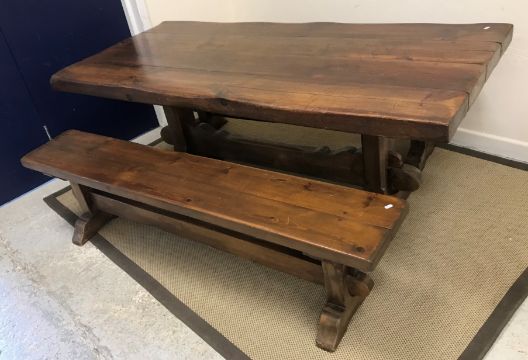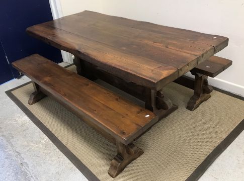 A 20th Century pine refectory style dining table, the four plank top on end trestle supports united by a centre stretcher 183 cm x 83 cm x 75 cm high (top 7 cm thick) formed from railway sleepers together with a pair of benches to match the above 172.5 cm x 30 cm x 45.5 cm high