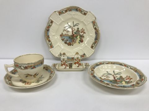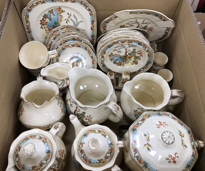 A large collection of Burslem Coronet dinner/tea wares including various sized plates, a graduated set of three jugs, tea pot and hot water pot, biscuit barrel, sauce boat, ashtray, toast rack, cruet etc with Willow Pattern style decoration