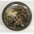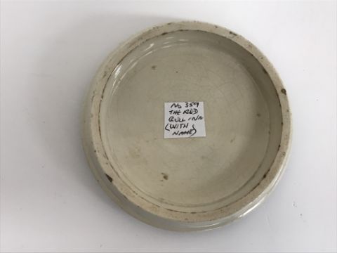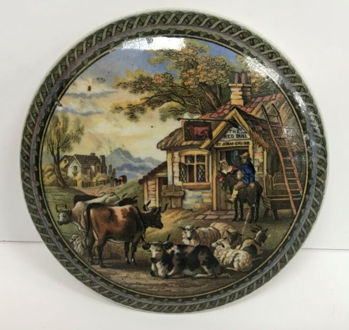 A 19th Century Pratt ware type pot lid "Red Bull Inn", with fancy border and named "The Red Bull Jonas Grubb" above the door, 12.5 cm diameter