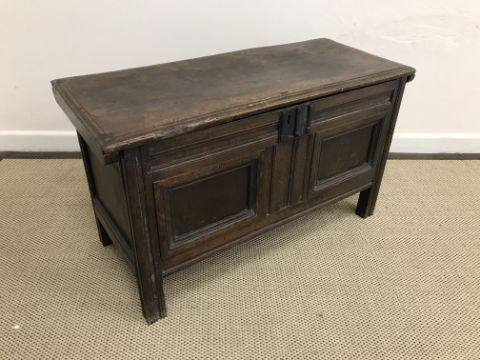 An 18th Century oak coffer, the single piece top with moulded edge over a two panelled front with applied mouldings, raised on moulded supports, 92 cm wide x 38 cm deep x 53 cm high
