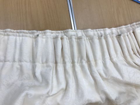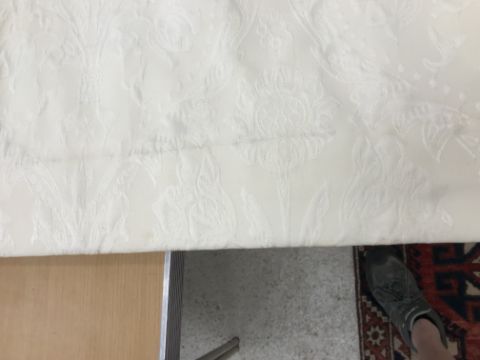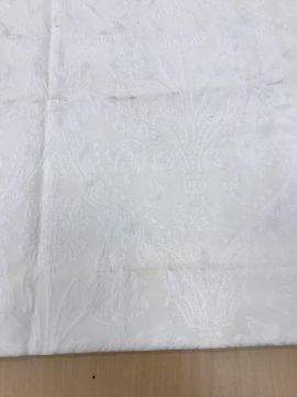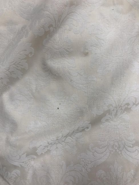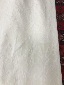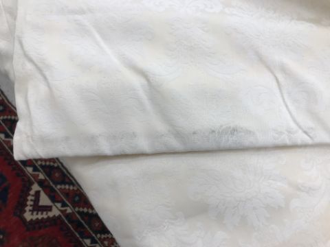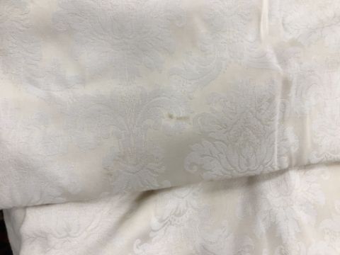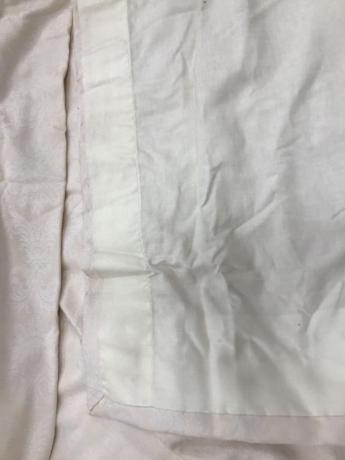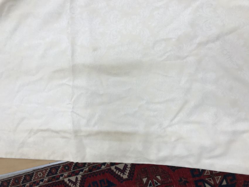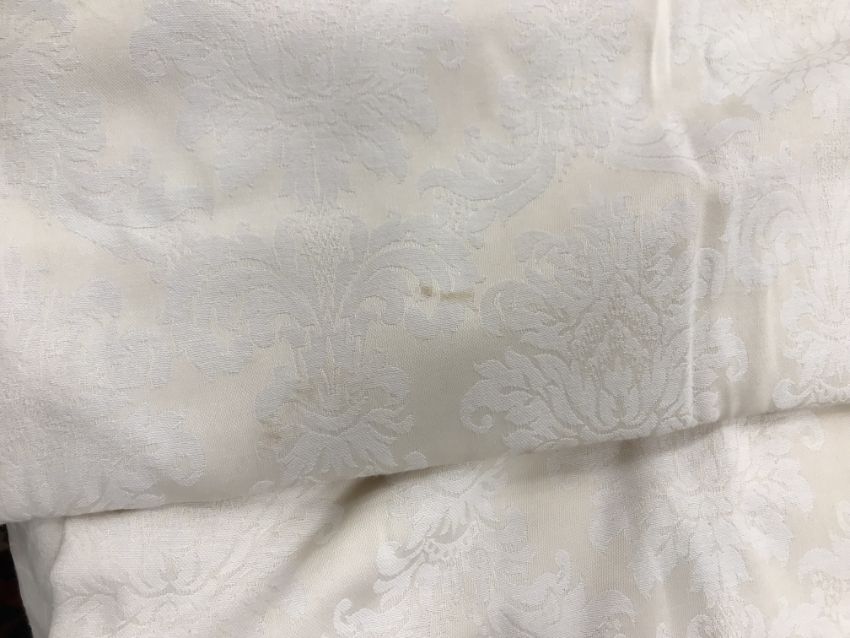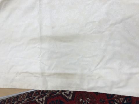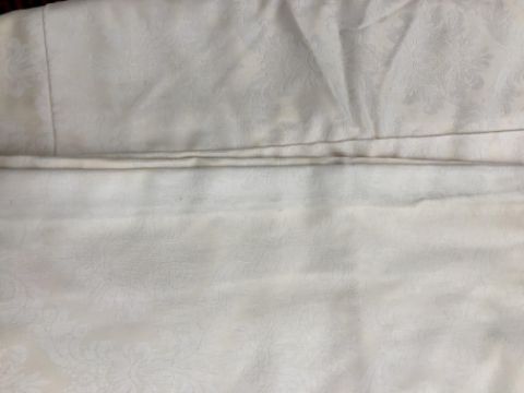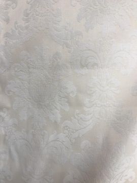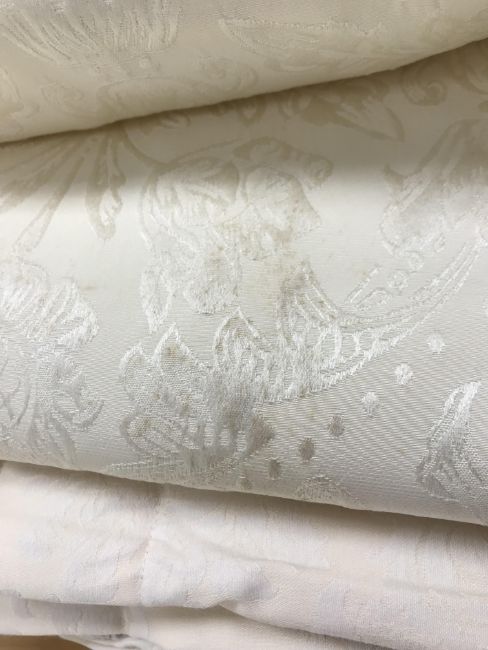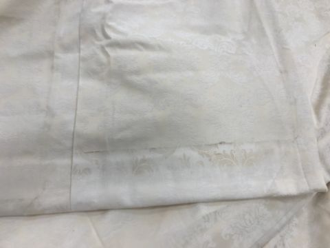 Four pairs of cream damask foliate design curtains, interlined, with a taped pencil pleat heading, first pair approx 130 cm drop x 158 cm wide at bottom, second pair approx 130 cm drop x 128 cm wide at bottom, third pair approx 130 cm drop x 194 cm wide at bottom and fourth pair approx 210 cm drop x 123 cm wide at bottom, together with two pairs of cream damask curtains with a foliate design, lined, with a taped pencil pleat heading, approx 215 cm drop x 188 cm wide at bottom, two blinds, approx 165 cm wide CONDITION REPORTS Four pairs of cream damask interlined curtains - Fair - with some sun fading, patching and marks. One pair - the length has been visibly altered.Two pairs of cream damask lined curtains - Fair - with one pair significantly marked approx 30 cm from the bottom and in general minor marks at the edges