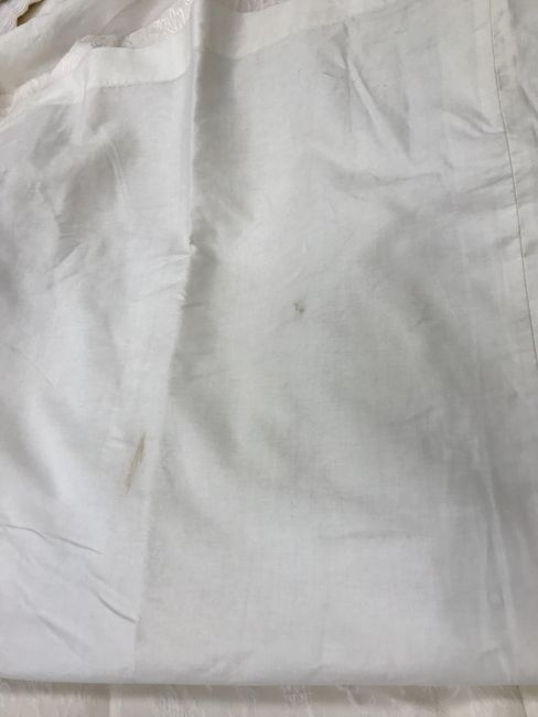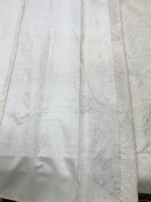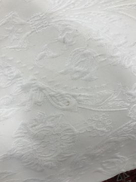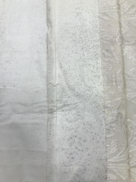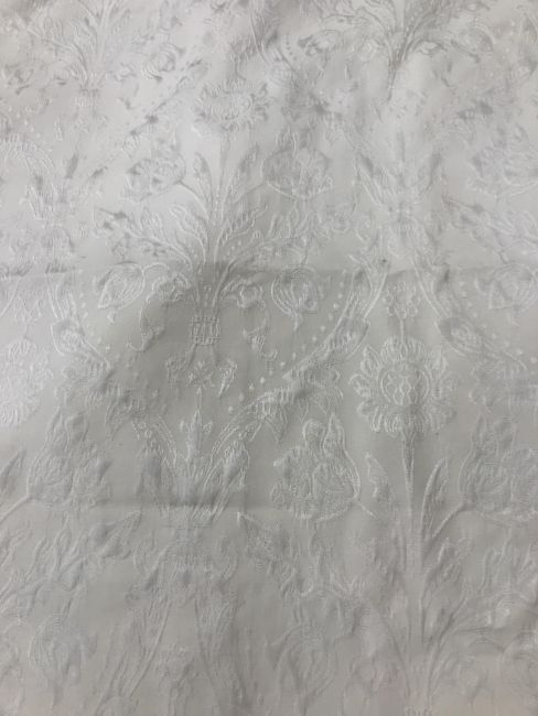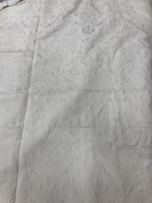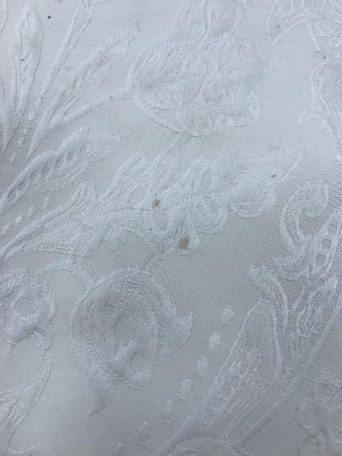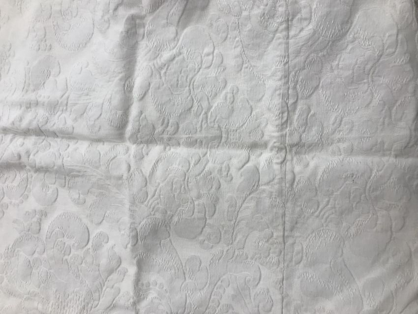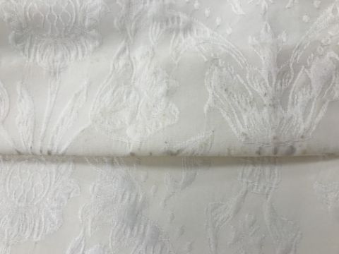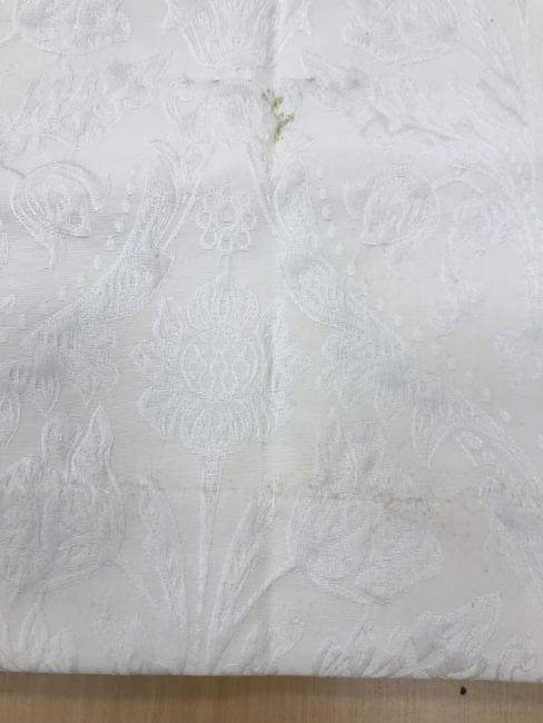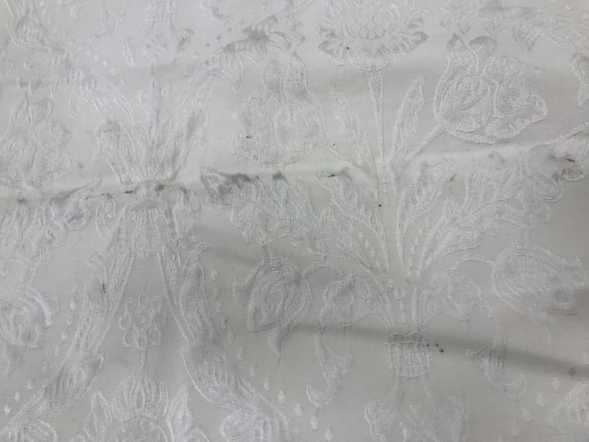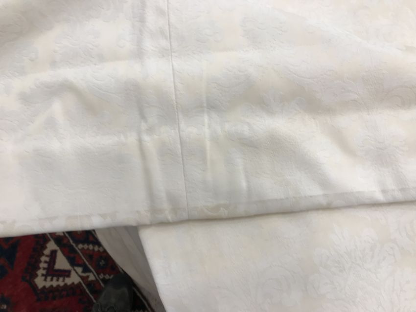 Four pairs of cream damask foliate design curtains, interlined, with a taped pencil pleat heading, first pair approx 130 cm drop x 158 cm wide at bottom, second pair approx 130 cm drop x 128 cm wide at bottom, third pair approx 130 cm drop x 194 cm wide at bottom and fourth pair approx 210 cm drop x 123 cm wide at bottom, together with two pairs of cream damask curtains with a foliate design, lined, with a taped pencil pleat heading, approx 215 cm drop x 188 cm wide at bottom, two blinds, approx 165 cm wide CONDITION REPORTS Four pairs of cream damask interlined curtains - Fair - with some sun fading, patching and marks. One pair - the length has been visibly altered.Two pairs of cream damask lined curtains - Fair - with one pair significantly marked approx 30 cm from the bottom and in general minor marks at the edges