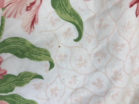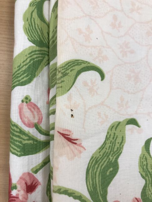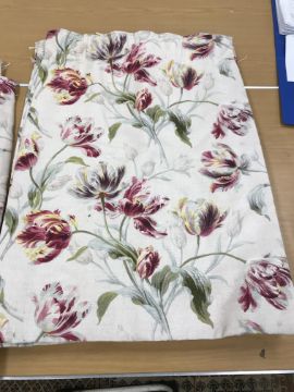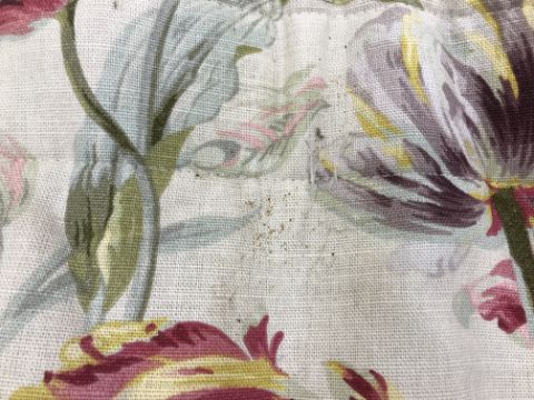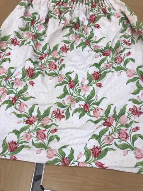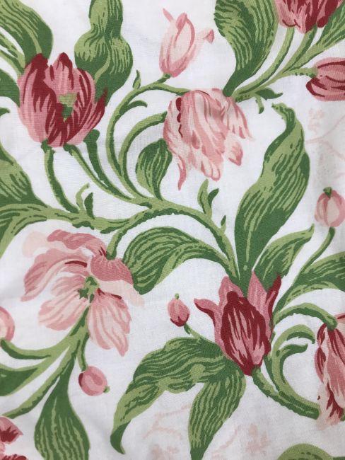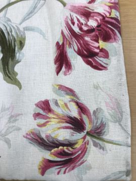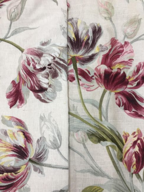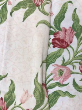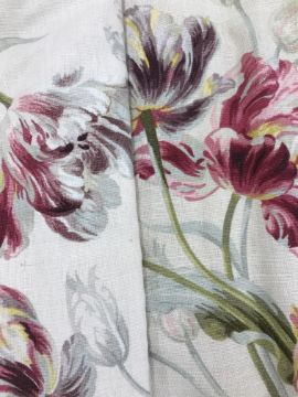Three pairs of Laura Ashley linen weave curtains with a cream ground and pink and yellow tulip design, interlined, with a taped pencil pleat heading, approx 83 cm drop x 61 cm wide at bottom, together with another two pairs of Laura Ashley linen weave curtains in the same design, interlined, with a taped pencil pleat heading, approx 90 cm drop x 133 cm wide at bottom, a pair of Jane Churchill Ltd "Richmond" cotton curtains with pink and green design on a cream ground, interlined, with a taped pencil pleat heading, 117 cm drop x 125 cm wide at bottom CONDITION REPORTS Three pairs - Fair - with minor marks and edge fadingTwo pairs - Fair - with some marks and discolouration to the liningJane Churchill "Richmond" curtains - Fair - linings are discoloured and there is some edge fading