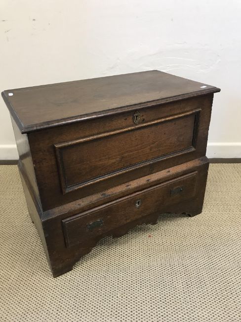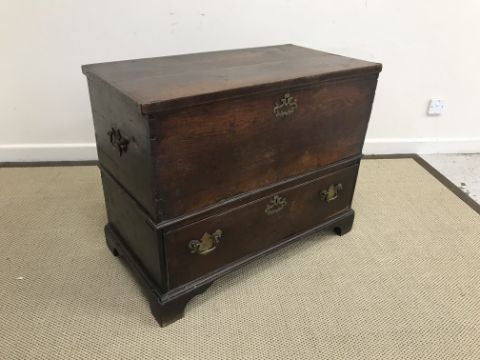 An 18th Century oak mule chest, the plain top opening to reveal a candle box with two drawers, over a single drawer, raised on bracket feet, the paper lining with handwritten inscription "E J Phipps A present from her grandfather James Phipps", the inscription also repeated on the underside of the candle box cover, 84 cm wide x 45 cm deep x 67 cm high