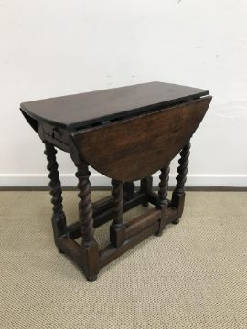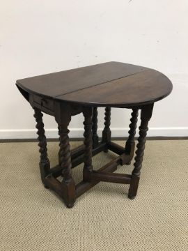 An 18th Century oak oval gate-leg drop-leaf tea table, on barley-twist supports united by stretchers, 107 cm wide x 77 cm deep x 71 cm high