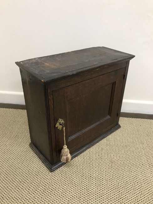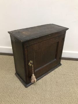 An 18th Century oak wall cupboard, the single panelled door within moulded stiles, opening to reveal four short drawers and two shelves, 48 cm wide x 20 cm deep x 43 cm high