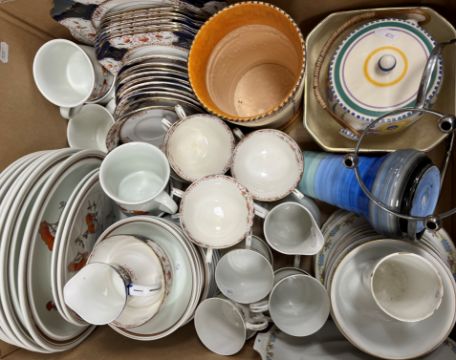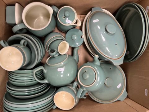 A collection of various Denby twin tone green glazed dinner wares and a box of various china wares to include Osborne China "Glendale" tea set, Royal Doulton "Wildflower" dinner and tea wares, Czechoslovakian part tea set, Crown Ducal vase, Shelley vase, Poole Pottery biscuit barrel, Queen Victorian Diamond Jubilee beaker, etc