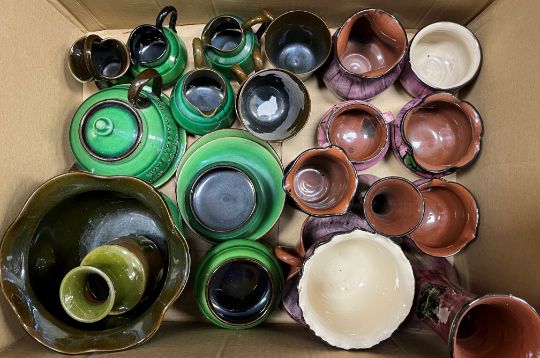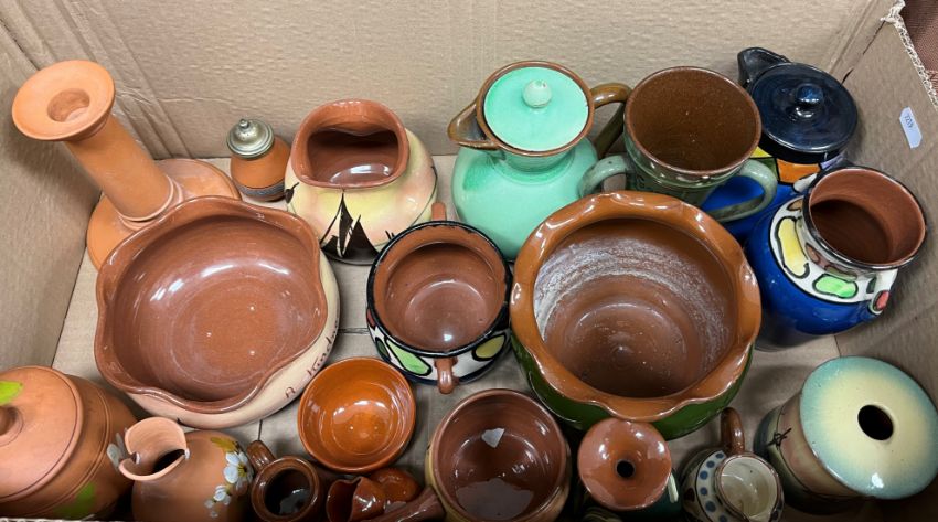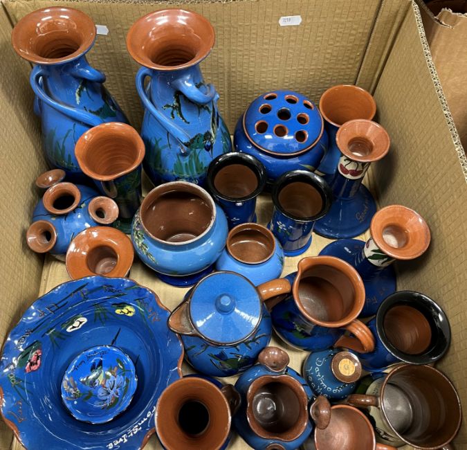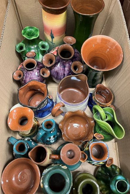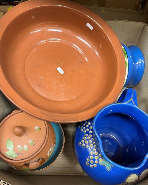Five boxes of various Torquay and other pottery china wares including pheasant decorated fruit bowl, Cracker Crocks Ltd fruit decorated jug, various motto ware, vases, jugs, bowls, etc