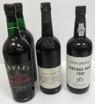 Two bottles Offley Boa Vista Vintage Port 1970, bottled 1972, one bottle Taylor's Quina de Vargellis Vintage Port 1982, bottled 1984 and one bottle Don Pavral Vintage Port 1982