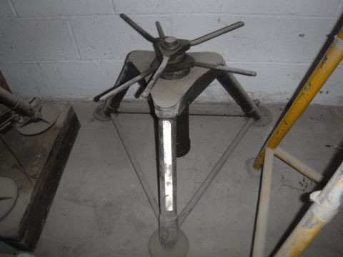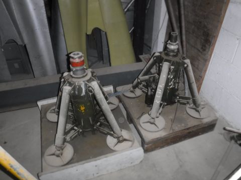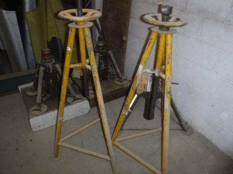 A pair of pneumatic jacks, the heavy duty cylinders on four supporting arms, one stencilled "VAL BNP/IS", two heavy duty manual jacks and another manual jack CONDITION REPORTS Pictures are of the 2 plates on each . The two yellow jacks have paint "26 FN 6 Trestle Nose 824/2". One hydraulic jack has painted "VALBNP18".