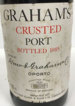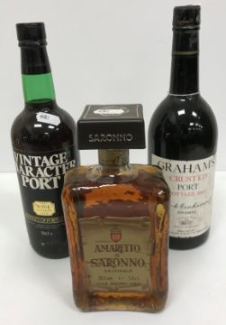 One bottle Graham's Crusted Port bottled 1985, one bottle Wine Society Vintage Character Port and one bottle Amaretto di Saronno, 50 cl