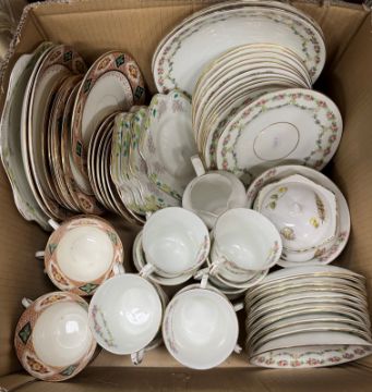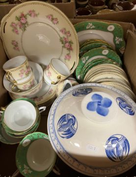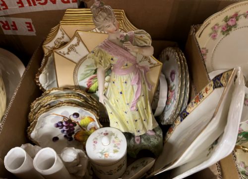 Three boxes of various china wares including Balmoral China floral decorated tea wares, Tuscan China green and gilt banded tea wares, Limoges for Blakeman & Henderson fruit decorated fruit set, another fruit set with handpainted decoration, initialled "SEW", Continental biscuit fired porcelain figure of a lady, etc