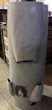 Two painted aluminium engine covers, believed to be De Havilland Devons, one bearing "Serial No. 427707", 152 cm long