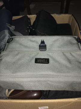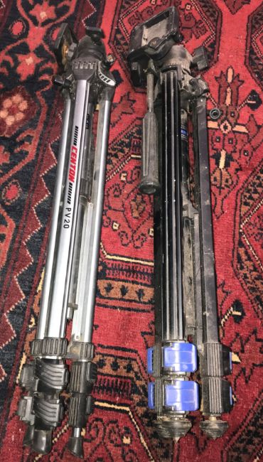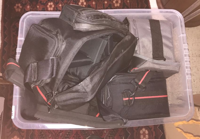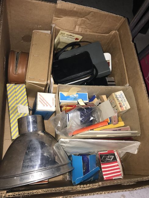 Two boxes of various camera cases, bags etc and two boxes of various photographic equipment and accessories including two tripods, No. 2 Brownie camera, Ilford P36 projector, Canon Powershot S50 camera and Aldis Magicolor slide viewer