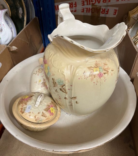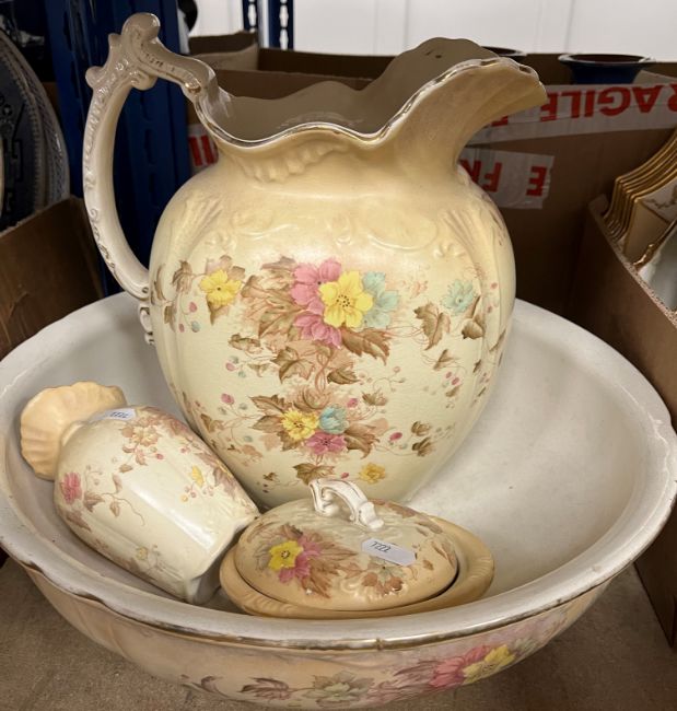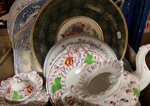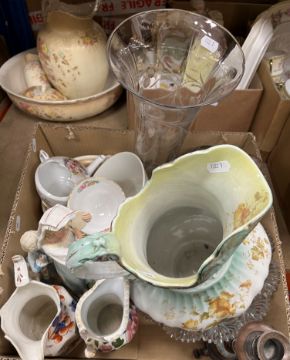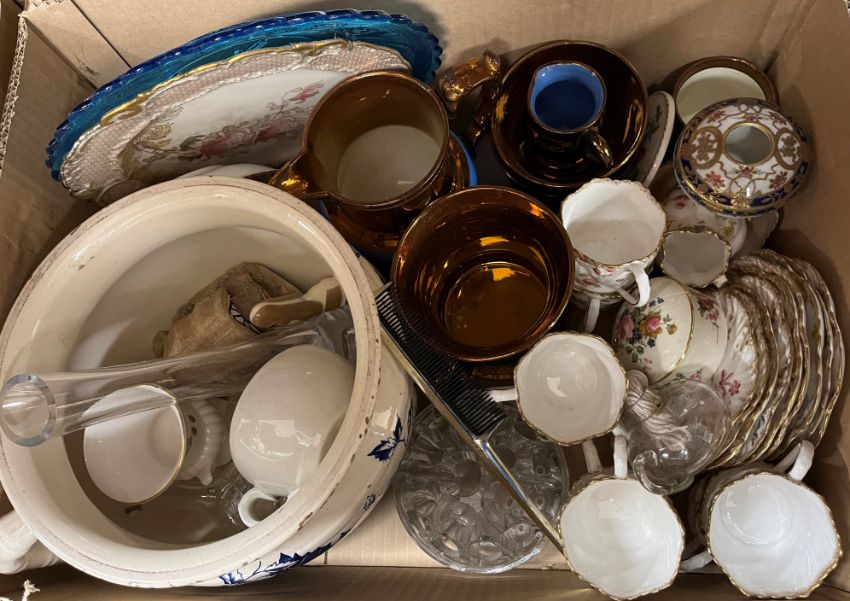 Four boxes of various china and glass wares including blue and white serving platters, copper lustre ware, tea wares, toilet set, etc and a bag of table linens etc