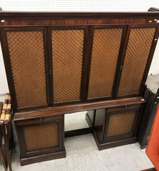 A mahogany side cabinet, the moulded dentil cornice over two pairs of brass lattice work decorated doors enclosing adjustable shelving on an associated pedestal base with two candle slides and drawers over matching lattice work doors on plinth bases, 166 cm wide x 37 cm deep x 189 cm high