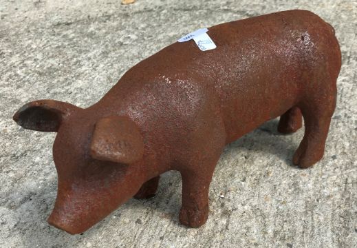 Two cast metal figures of pigs, with rust style patination, 30 cm long