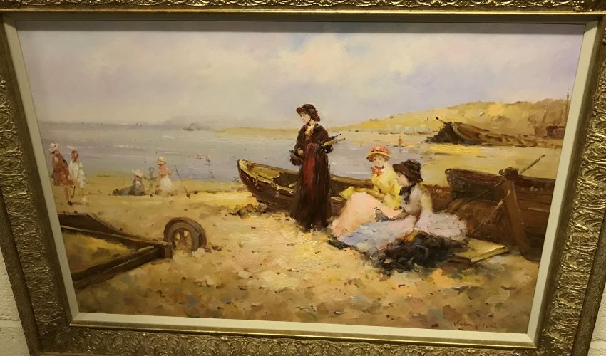 VLADIMIR PETROV "Women in late 19th Century costume on a beach with boats", Impressionist study, oil on canvas, signed lower right, 58 cm x 88 cm