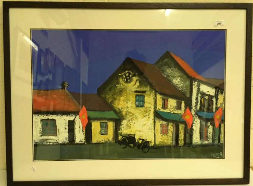 DAO HAI PHONG (Vietnamese b. 1965) "Houses with flags flying, a tricycle in foreground", tempera, signed and dated '97 lower right, bears "Merlin Frame Maker and Art Gallery Ltd Singapore" label verso, 51 cm x 76 cm