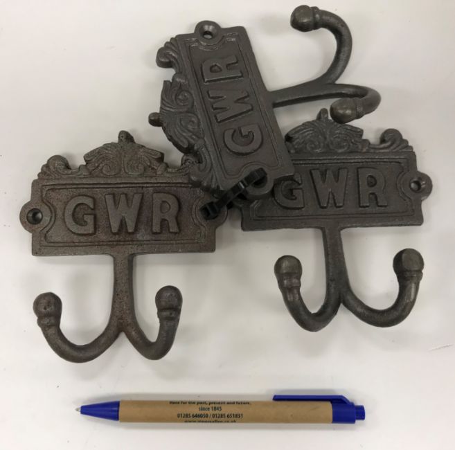 Two modern cast metal coat hooks inscribed "GWR", 9 cm wide 29 cm deep x 16 cm high, together with a set of three smaller double coat hooks inscribed "GWR", 11 cm wide x 4 cm deep x 12 cm high