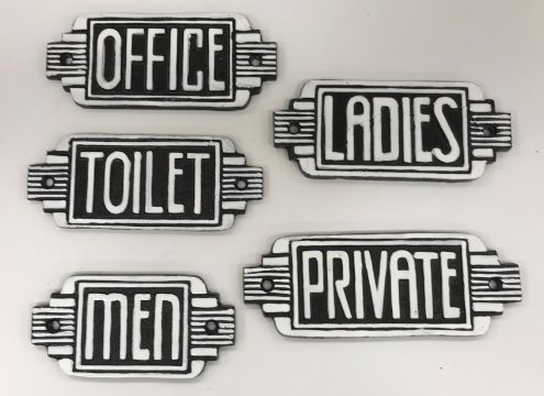 A collection of five cast metal Art Deco style door signs inscribed "Office", "Men", "Toilet", "Ladies" and "Private", varying sizes, all 6 cm high
