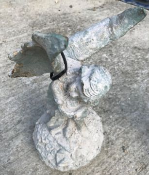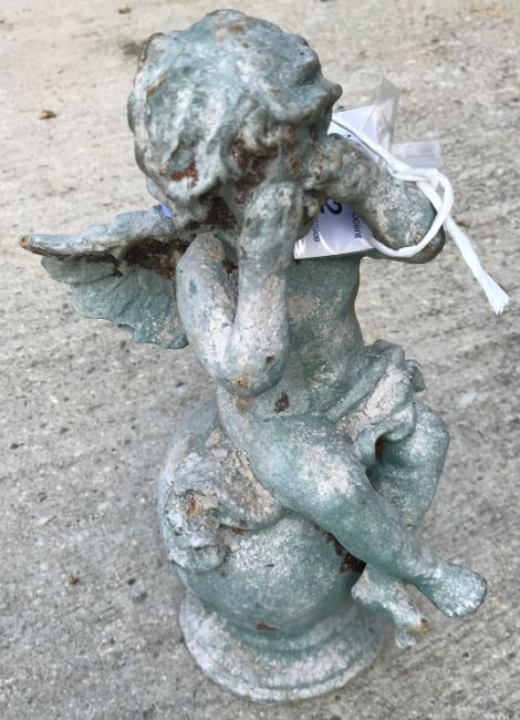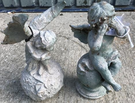 A cast metal figure of a cherub crying sat on a bal, with verdigris style patination, 31 cm high, together with another similar of a fairy, 30 cm high