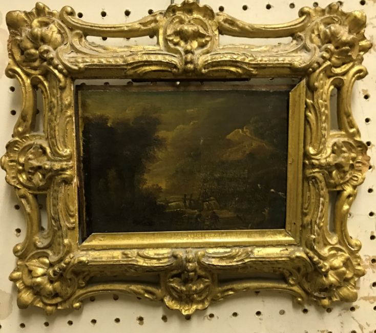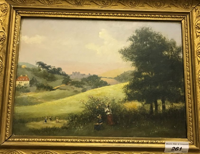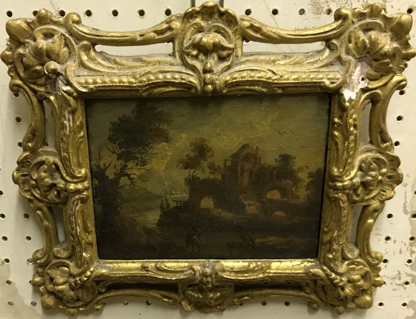 19TH CENTURY CONTINENTAL SCHOOL "Study of Continental landscape with ruins and figure in foreground", oil on canvas, bears indistinct writing verso, housed in a gilt shell and scrolling frame, including frame 24 cm x 28 cm, together with a companion pair, CIRCA 1900 ENGLISH SCHOOL "Young women picking flowers in a landscape with children in foreground", oil on board, indistinctly signed lower right, 21 cm x 29 cm and E KLUYVER "Winter landscape with figures and cottage in foreground", oil on board, signed lower left, 20.5 cm x 30 cm